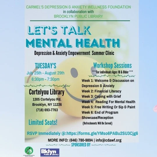 Depression & Anxiety Empowerment Summer Clinic Tuesday, July 25, 2023 6:30 PM Tuesday, August 29, 2023 7:30 PM Cortelyou Library 1305 Cortelyou Road Brooklyn, NY, 11226 United States (map) Google Calendar ICS Click Here to Register